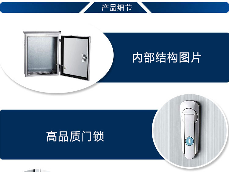 1、戶外配電箱采用304不銹鋼板材及優(yōu)質(zhì)配件制造。